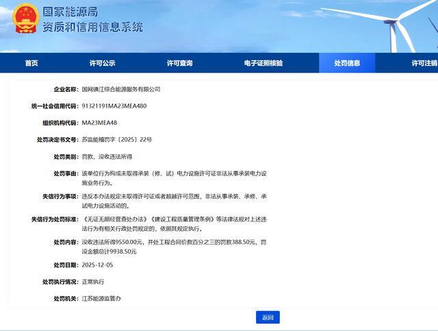 近日,国家能源局资质和信用信息系统信息显示,国网镇江综合能源服务有限公司因未取得承装(修、试)电力设施许可证非法从事承装电力设施业务行为。被江苏能源监管办给予其没收违法所得9550.00元,并处工程合同价款百分之三的罚款388.50元,罚没金额总计9938.50元的处罚。 天眼查显示国网镇江综合能源服务有限公司,...